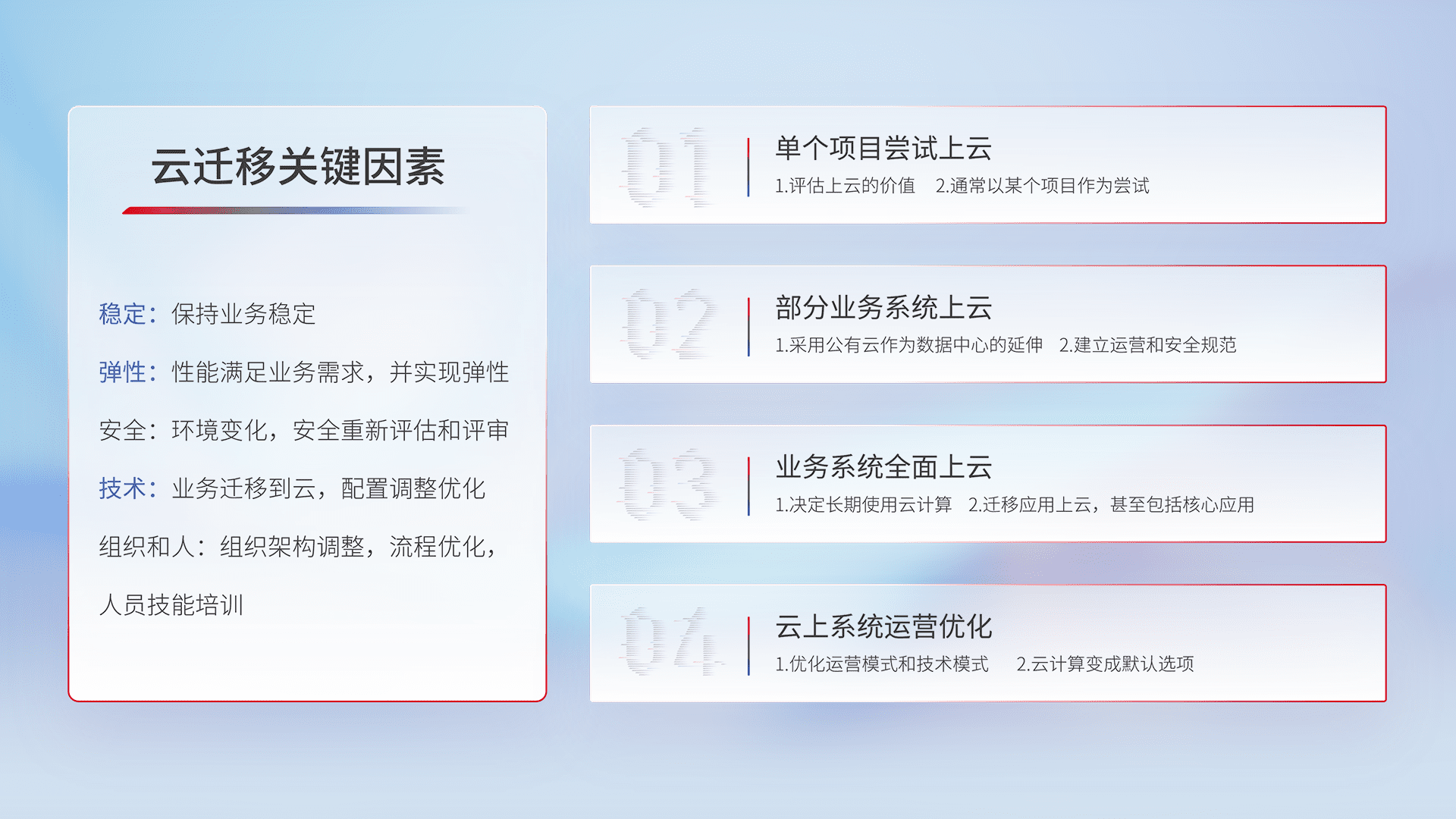 结合实际业务,,,从规划设计、、云平台选型、、、、云原生改造、、、、数据迁移、、集成交付,,,,迁移全过程为客户识别最佳上云路径,,做好风险识别管理,,设计网络架构、、身份权限、、、、安全审计合规、、、、操作审计、、、、日志审计、、、、监控告警策略、、、、多站点容灾设计等,,对云上基础设施进行整体规划,,提升IT治理水平,,,,以满足弹性、、高可用、、高性能的需求。。。