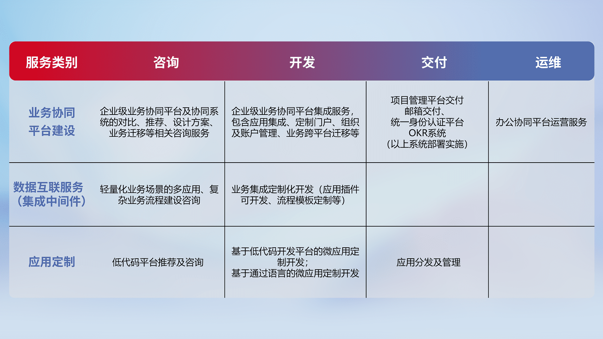 针对钉钉、、、企微、、、、IDaas等平台级产品提供产品的规划、、方案、、交付、、、定制化开发等服务,,,,实现如统一协同办公、、、、智能客户服务、、混合会议管理、、智能数据查询、、等业务场景,,,,实现数字化转型。。